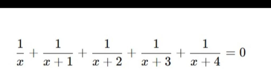 `1/x+1/(x+1)+1/(x+2)+1/(x+3)+1/(x+4)=0` (ĐK: `x\ne0,x\ne-1,x\ne-2,x\ne-3,x\ne-4)`