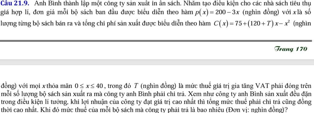 `-` Giá mỗi bộ sách ban đầu là `p(x)=200-3x` nghìn đồng.