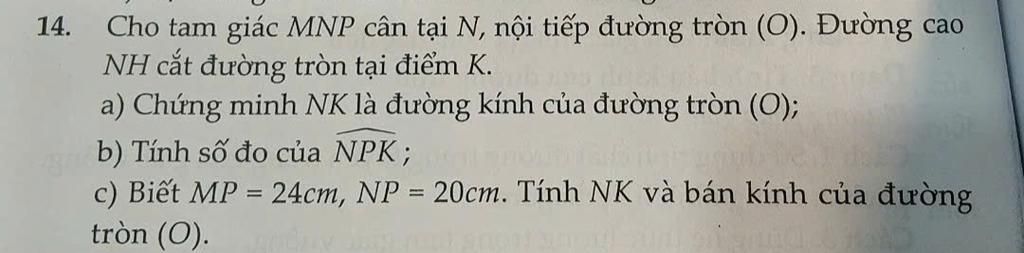 c) Biết MP = 24cm, NP = 20cm. Tính NK và bán kính của đường