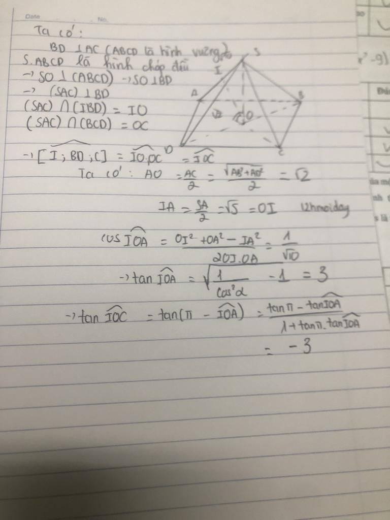 Cho hình chóp tứ giác đều S.ABCD có cạnh đáy bằng 2,cạnh bên bằng √10.Gọi I là trung điểm của SA.Tính tan góc phẳng nhị diện [I,BD,C]
