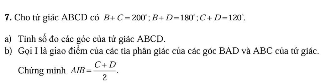 7. Cho tứ giác ABCD có B+C=200 ;B+D=180;C+D=120.