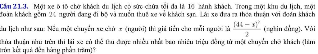 `=>` Với mỗi chuyến xe, lái xe có thể thu được nhiều nhất `6307,5` nghìn đồng hay xấp xỉ $\fbox{6,31}$ triệu đồng