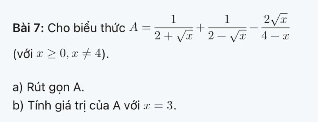`A = 1/( 2 + \sqrt{x} ) + 1/( 2 - \sqrt{x}) - (2\sqrt{x})/(4-x)` ĐKXĐ `x >= 0 ; x \ne 4`