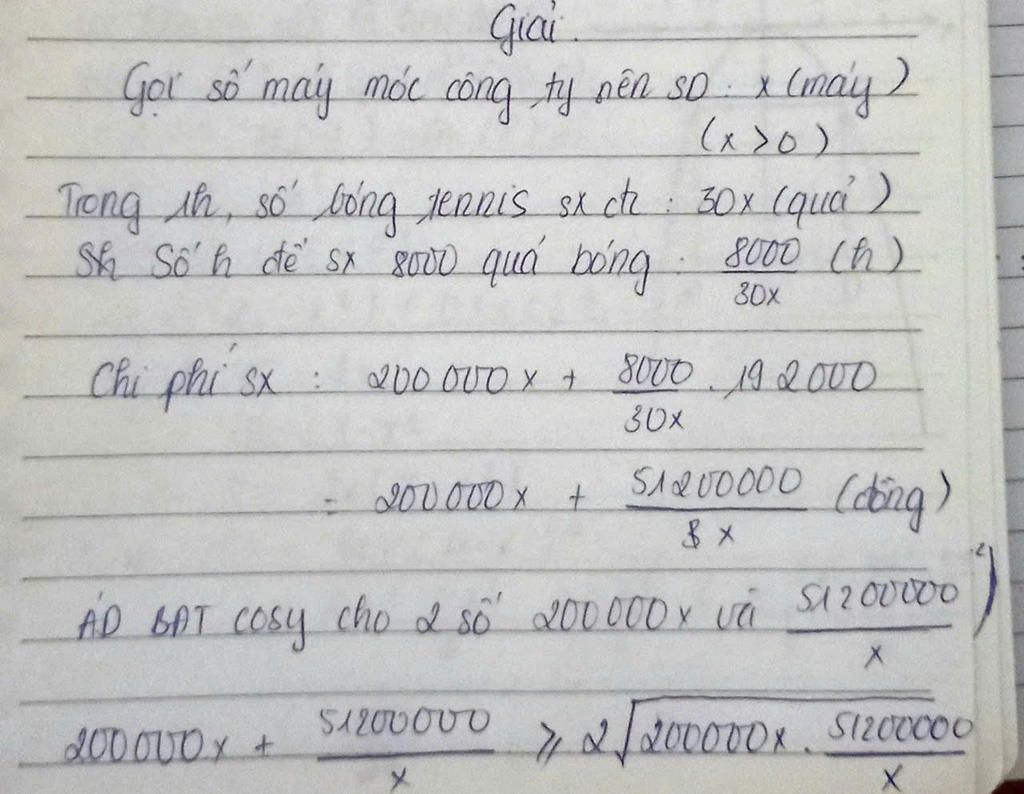 Một công ty sản xuất dụng cụ thể thao nhận được một đơn đặt hàng sản xuất 8 000 quả bóng tennis. Biết công ty này có 30 máy và mỗi máy có thể sản xuất 30 quả bóng trong một giờ. Chi phí thiết lập các máy này là 200 nghìn đồng cho mỗi máy. Khi được thiết lập, hoạt động sản xuất sẽ hoàn toàn tự động dưới sự giám sát. Số tiền phải trả cho người giám sát là 192 nghìn đồng mỗi giờ. Số máy công ty nên sử dụng để sản xuất đơn hàng trên là bao nhiêu để chi phí hoạt động là thấp nhất?
