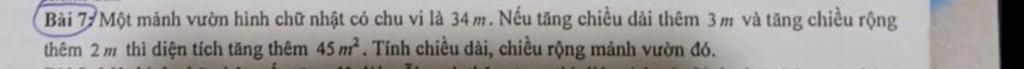 Theo đề bài, chu vi mảnh vườn là $34$ m, ta có p/trình: