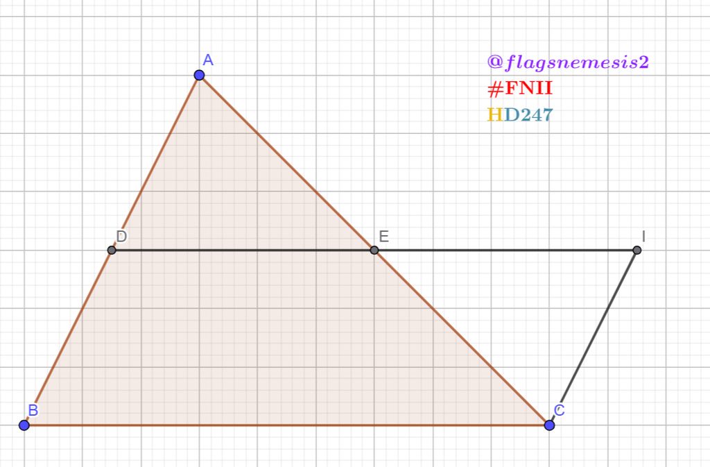 Mà $DI = BC (cmt) \Rightarrow \begin {array}{|c|}\hline DE = \dfrac{1}{2}BC \\\hline \end {array}$