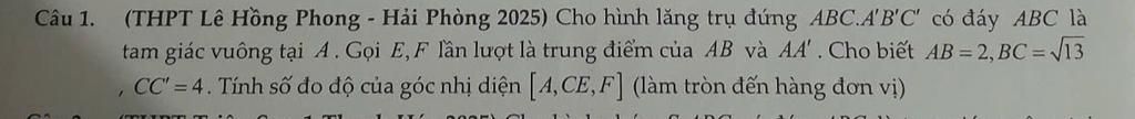 tam giác vuông tại A. Gọi E, F lần lượt là trung điểm của AB và A4' . Cho biết AB = 2, BC = V13