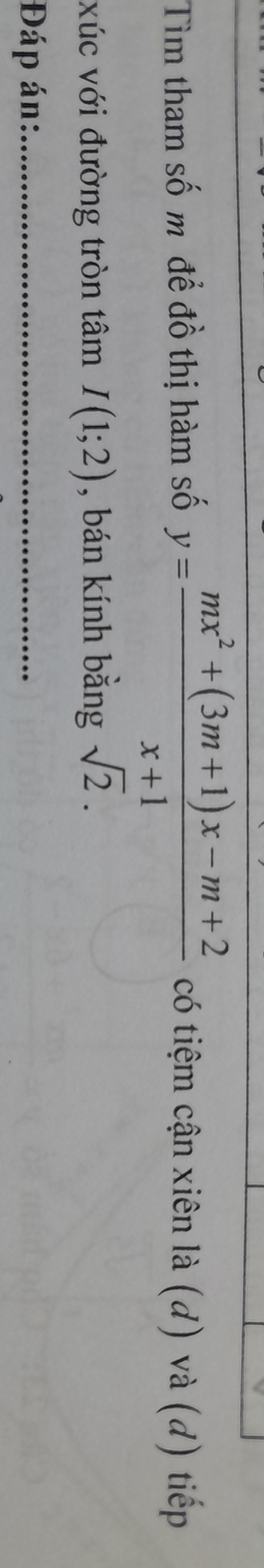 `(d)` tiếp xúc với đường tròn tâm `I(1;2)`, bán kính bằng `sqrt2`