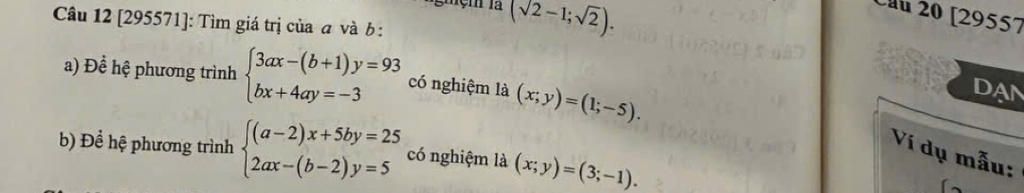 Vậy khi `a=2;b=-5` thì hệ phương trình có nghiệm `(x;y)=(3;-1)`