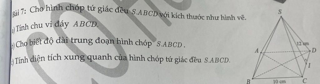 Độ dài trung đoạn `SI` của hình chóp `S.ABCD` là `12cm`