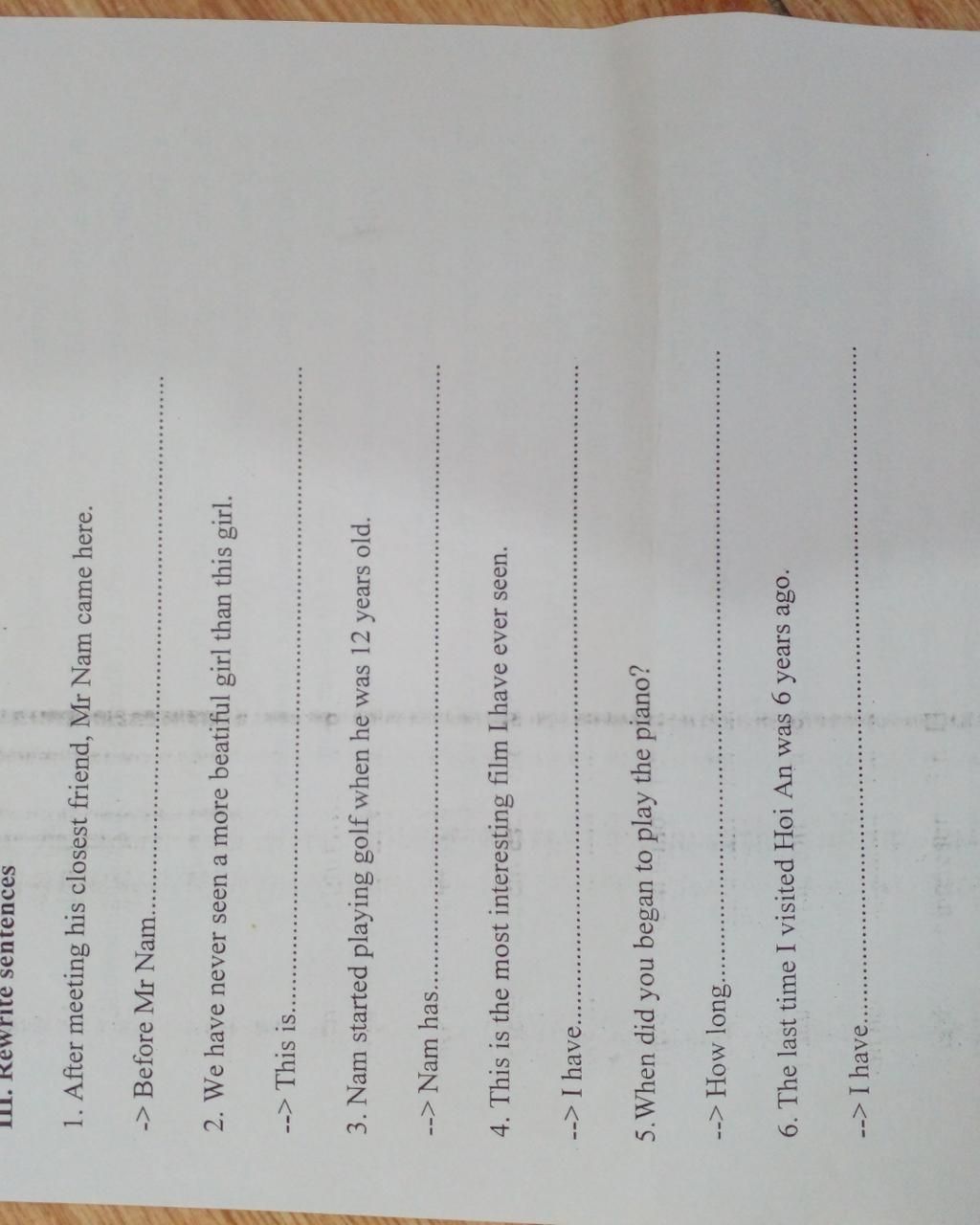 5. How long have you played the piano? (nếu câu đề bài cho ở thì QKĐ thì câu chuyển ở thì HTHT và ngược lại)