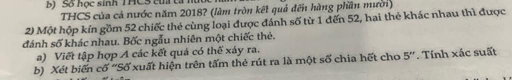 Xác suất của biến cố "Số xuất hiện trên tấm thẻ rút ra là một số chia hết cho `5`" là: