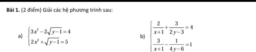 `{(3x^2-2sqrt(y-1)=4),(2x^2+sqrt(y-1)=5):}` `ĐK y >=1`