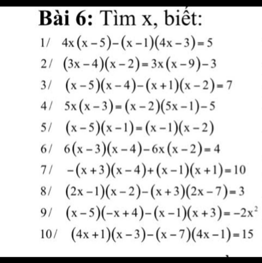 `4)5x.(x-3)=(x-2).(5x-1)-5`