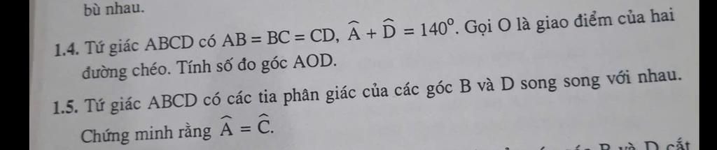 1.4. Tứ giác ABCD có AB = BC = CD, Â + D = 140°. Gọi O là giao điểm của hai
