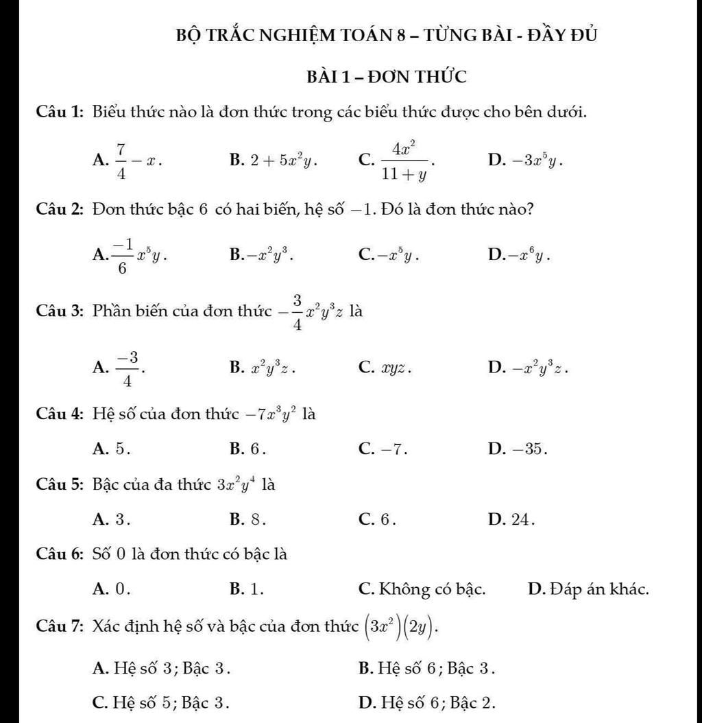 `A.-1/6x^5y` có hệ số là `-1/6` và bậc `5+1=6 ->`Loại