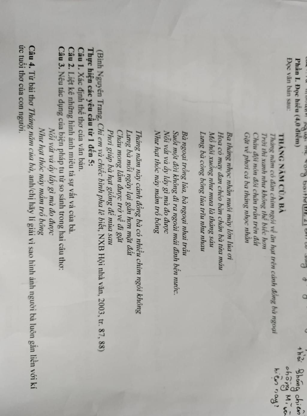 `-` Hình ảnh người bà luôn gắn liền với kí ức tuổi thơ bởi bà không chỉ là người nâng bước ta những tháng ngày đầu tiên mà còn là hiện thân của yêu thương, của sự hi sinh, tảo tần và gắn bó.Trong bài thơ “Tháng năm của bà”, người bà hiện lên giữa cánh đồng quê với bao nỗi nhọc nhằn, chịu thương chịu khó, suốt đời chỉ quanh quẩn bên mái đình, bến nước.Hình ảnh bà gặt lúa, lưng còng, bàn chân tứa máu, mồ hôi nhỏ như mưa thấm vào đất, vào hạt thóc, trở thành biểu tượng thiêng liêng của sự sống, của quê hương, của tình yêu không bao giờ phai nhạt trong trái tim mỗi con người. Những ký ức về bà luôn dịu dàng, ấm áp và thổn thức, vì bà là người gìn giữ nếp nhà, là người gieo hạt giống yêu thương cho cuộc đời cháu con. Khi lớn lên, giữa bộn bề cuộc sống, người ta dễ quên nhiều thứ, nhưng bóng dáng lưng còng của bà, giọng nói, đôi bàn tay thô ráp, những mùa gặt tháng năm bên ruộng lúa quê hương thì không bao giờ phai nhòa trong ký ức.