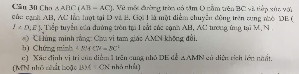 Câu 30 Cho AABC (AB = AC). Vẽ một đường tròn có tâm O nằm trên BC và tiếp xúc với