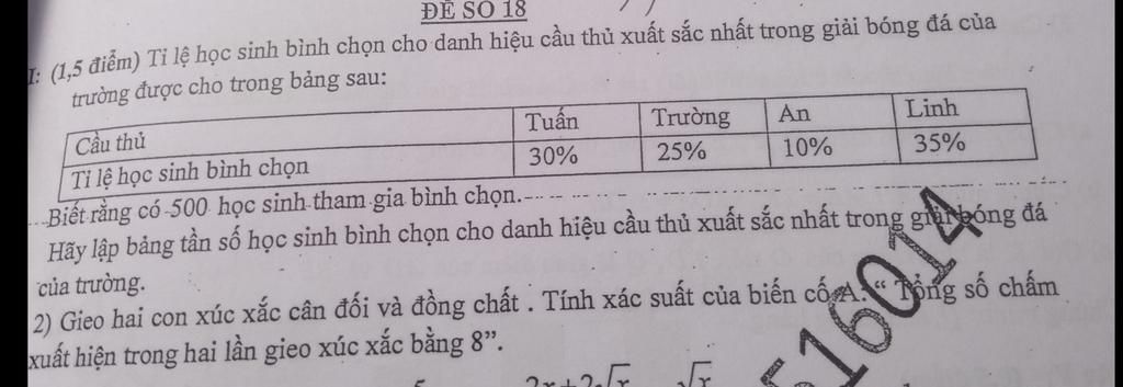 v: (1,5 điểm) Tỉ lệ học sinh bình chọn cho danh hiệu cầu thủ xuất sắc nhất trong giải bóng đá của