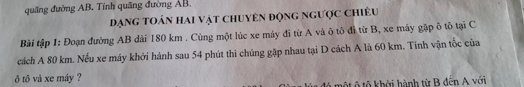 `**`Khi xe máy khởi hành trễ `54` phút (`9/10` giờ), thì gặp ô tô tại `D` và cách `A` 60km