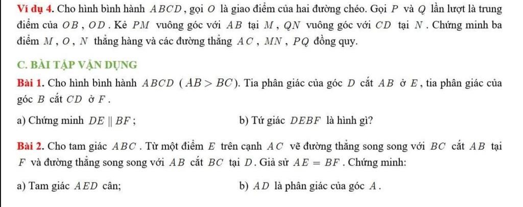 Ví dụ 3. Cho hình bình hành ABCD . Gọi E là trung điểm của AD, F là trung điểm của BC . Chứng minh: