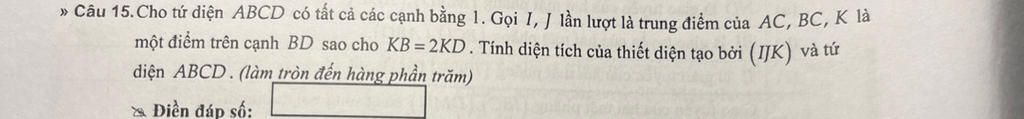 » Câu 15. Cho tứ diện ABCD có tất cả các cạnh bằng 1. Gọi I, J lần lượt là trung điểm của AC, BC, K là