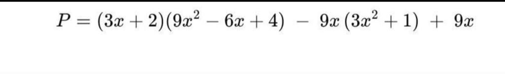 `P=(3x+2)(9x^2-6x+4)-9x(3x^2+1)+9x`