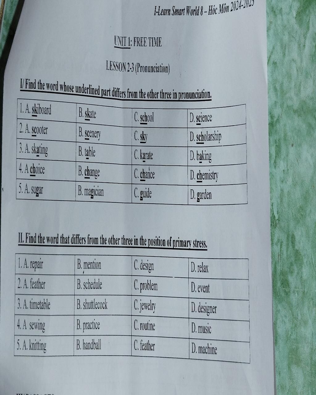 Giải thích: 'designer' có dấu nhấn ở âm tiết thứ hai, các từ còn lại có dấu nhấn ở âm tiết thứ nhất.