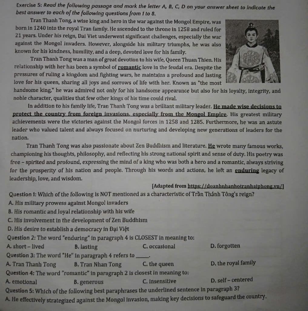 → Đáp án: `D`. Trần Thánh Tông was a king who supported a multi-wife tradition and ignored family bonds.