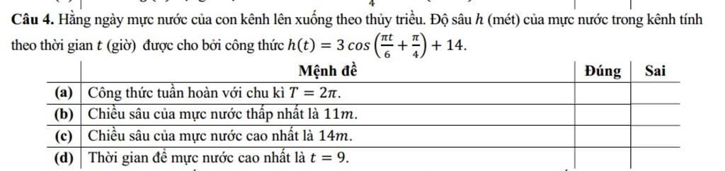 `->` Thời gian để mực nước cao nhất khi `cos ((\pi t)/(6)+(\pi)/(4))=1`