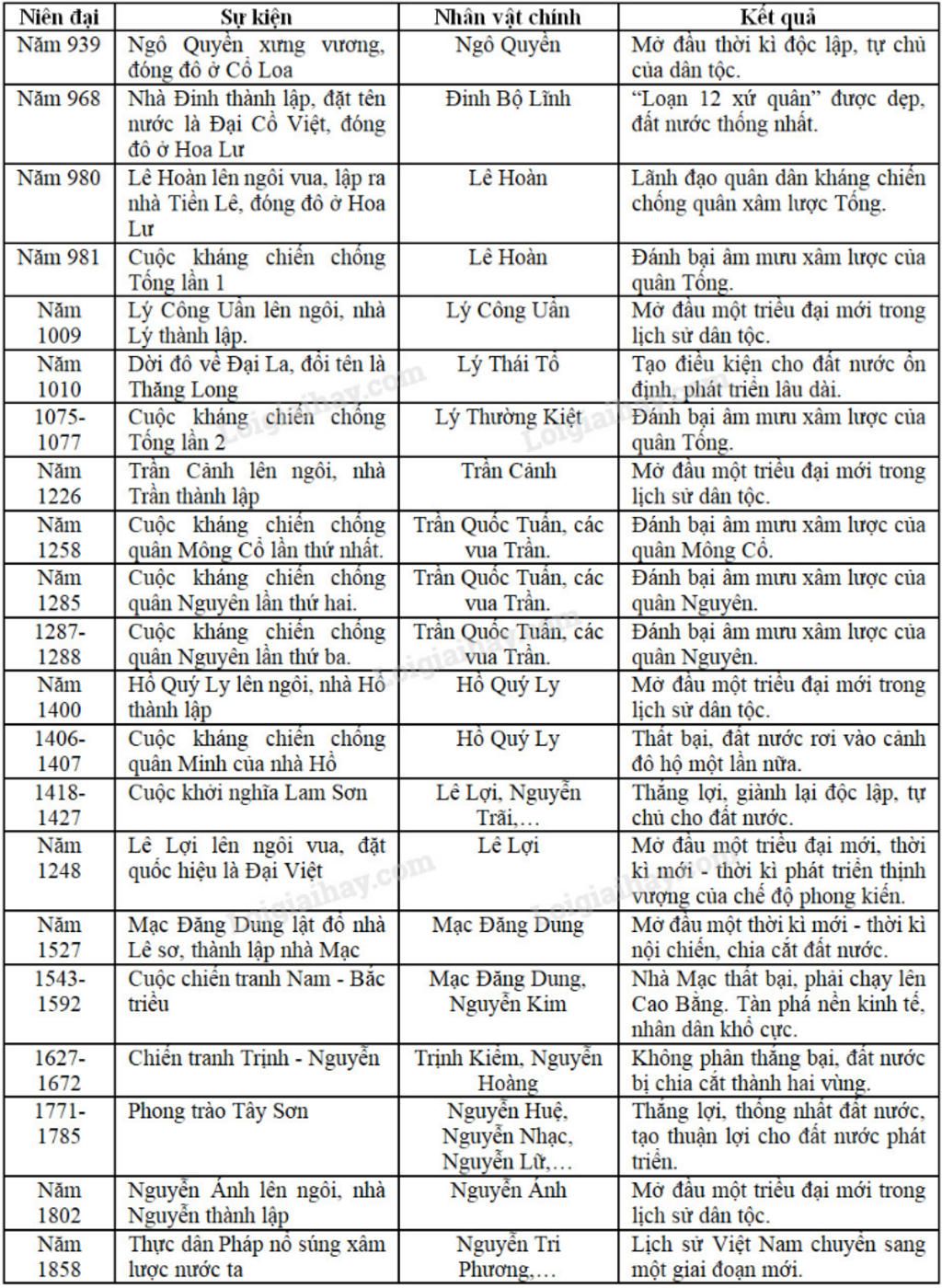 938Ngô Quyền xưng vương, đóng đô ở Cổ Loa965-967Loạn 12 sứ quân.968Đinh Bộ Lĩnh dẹp "Loạn 12 sứ quân".968-980Đinh Bộ Lĩnh lên ngôi vua, đặt tên nước là Đại Cồ Việt, đóng đô ở Hoa Lư981Lê Hoàn đánh bại quân Tống981-1009Lê Hoàn lên ngôi, lập nhà Tiền Lê, đóng đô ở Hoa Lư1009Lý Công Uẩn lên ngôi, lập ra nhà Lý1010Lý Thái Tổ dời đô về Đại la, đổi tên thành Thăng Long1042Nhà Lý ban hành Hình thư1054Nhà Lý đổi tên nước thành Đại Việt.1070Nhà Lý lập Văn Miếu thờ Khổng Tử1076Lập Quốc Tử Giám ở kinh đô Thăng Long1077Lý Thường Kiệt lãnh đạo kháng chiến chống Tống thắng lợi1226Trần Cảnh lên ngôi vua lập ra nhà Trần1230nhà Trần ban hành Quốc triều hình luật1253Lập Quốc học viện và Giảng võ đường1258Chiến thắng quân xâm lược Mông Cổ lần thứ nhất1285Chiến thắng quân Nguyên lần hai1288Chiến thắng quân Nguyên lần ba1400Hồ Quý Ly lật đổ nhà Trần, lập nên nhà Hồ.1401Định quan chế và hành luật của nước Đại Ngu.1406Hơn 20 vạn quân Minh kéo vào xâm lược nước ta.1407Cuộc kháng chiến của nhà Hồ thất bại.1418Cuộc khởi nghĩa Lam Sơn, do Lê Lợi lãnh đạo, bùng nổ.1427Cuộc khởi nghĩa Lam Sơn thắng lợi.1428Lê Lợi lên ngôi vua ở Đông Đô, đặt lại quốc hiệu Đại Việt.1442Khoa thi hội đầu của nhà Lê được tổ chức.1483Lê Thánh Tông biên soạn và ban hành bộ luật Hồng Đức.1511Khởi nghĩa Trần Tuân.1516Khởi nghĩa Trần Cảo.1527Mạc Đăng Dung lật đổ nhà Lê Sơ, thành lập nhà Mạc.1543-1592Thời kỳ Lê-Mạc và chiến tranh Nam-Bắc triều.1592Nhà Mạc sụp đổ.1627-1672Chiến tranh Trịnh-Nguyễn, đất nước bị chia cắt thành 2 vùng.1739-1769Khởi nghĩa Hoàng Công Chất.1740-1751Khởi nghĩa Nguyễn Danh Phương.1741-1751Khởi nghĩa Nguyễn Hữu Châu.1771Khởi nghĩa nông dân Tây Sơn bùng nổ, do ba anh em Nguyễn Nhạc, Nguyễn Huệ, Nguyễn Lữ lãnh đạo.1777Nghĩa quân Tây Sơn lật đổ chính quyền chúa Nguyễn ở Đàng Trong.1785Nguyễn Huệ chỉ huy quân Tây Sơn tiêu diệt 5 vạn quân Xiêm ở Rạch Gầm - Xoài Mút.1786Nghĩa quân Tây Sơn tiến ra Bắc, lật độ chính quyền chúa Trịnh.1789Vua Quang Trung đại phá 29 vạn quân Thanh.1789-1792Chính quyền của Quang Trung thực thi nhiều chính sách cải cách tiến bộ.1792Quang Trung đột ngột qua đời.1802Nguyễn Ánh lên ngôi, nhà Nguyễn thành lập.1804Vua Gia Long đặt quốc hiệu là Việt Nam, kinh đô đóng ở Phú Xuân (Huế).1815Ban hành bộ Hoàng triều luật lệ (Bộ luật Gia Long).1820Minh Mạng lên ngôi hoàng đế.1821-1827Khởi nghĩa Phan Bá Vành.1831-1832Nhà Nguyễn thời Minh Mạng sắp xếp lại đơn vị hành chính trong cả nước.1833-1835Khởi nghĩa Lê Văn Khôi.1838Quốc hiệu Đại Nam.1854-1856Khởi nghĩa Cao Bá Quát.1858Thực dân Pháp nổ súng xâm lược Việt Nam tại bán đảo Sơn Trà-Đà Nẵng.