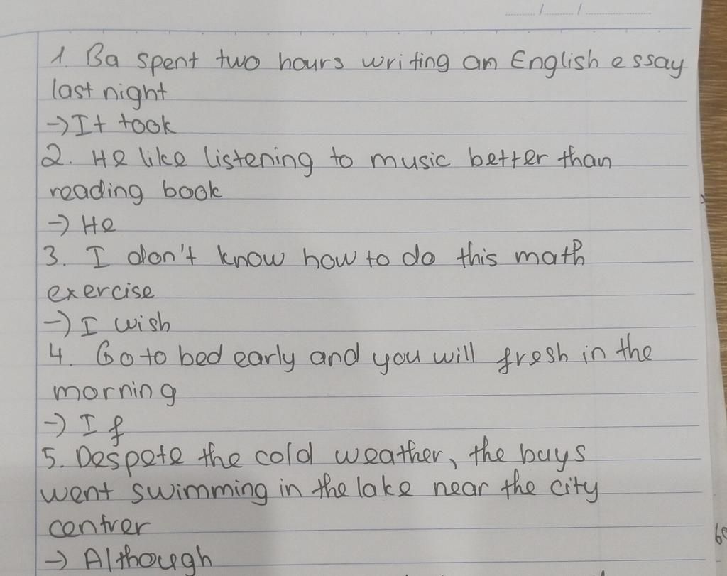 ` bb1. -> ` It took Ba two hours to write an English essay last night.