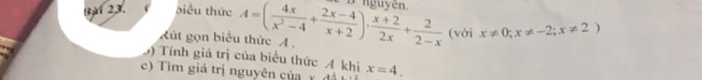 `A=((4x)/(x^2-4)+(2x-4)/(x+2))*(x+2)/(2x)+2/(2-x)` `(x\ne0;x\ne2;x\ne-2)`