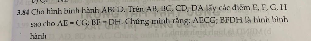 ??? đề yêu cầu chứng minh AECG, BFDH là hình bình hành tự dưng chứng minh ABCD là hình bình hành làm gì??? Trong khi ở đầu bạn lại dùng là AB=CD vì ABCD là hình bình hành là sao nữa vậy bạn??
