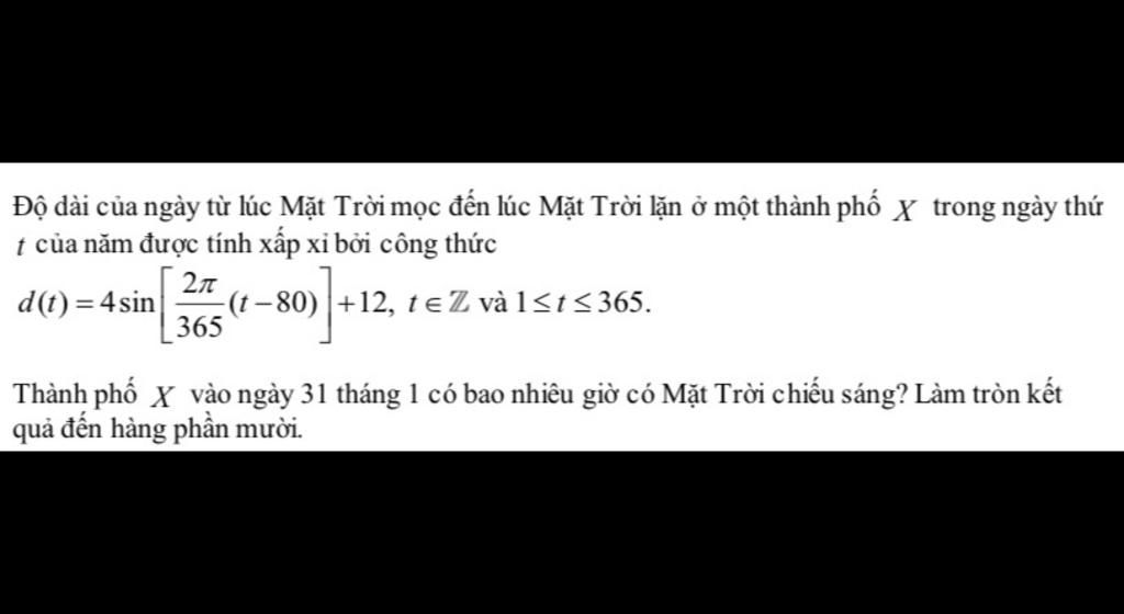 `d(t)=4sin[(2pi)/365 (t-80)] +12` với `t in ZZ ` và `1<=t<=365`
