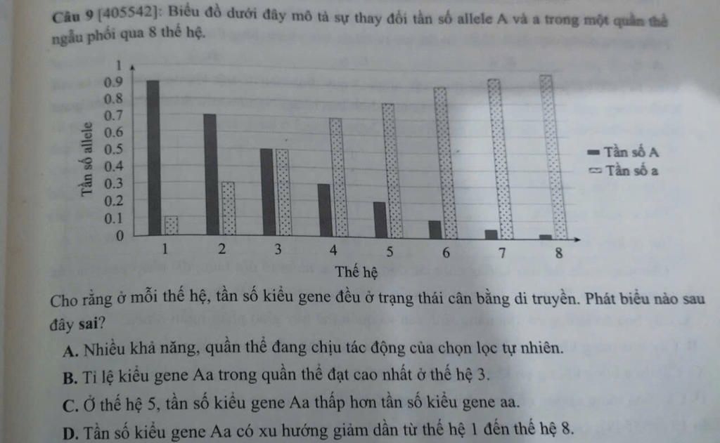Câu 9 (405542]: Biểu đồ dưới đây mô tả sự thay đổi tần số allele A và a trong một quần thể
