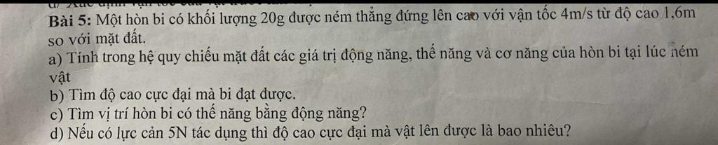 Bài 5: Một hòn bi có khối lượng 20g được ném thẳng đứng lên cao với vận tốc 4m/s từ độ cao 1,6m