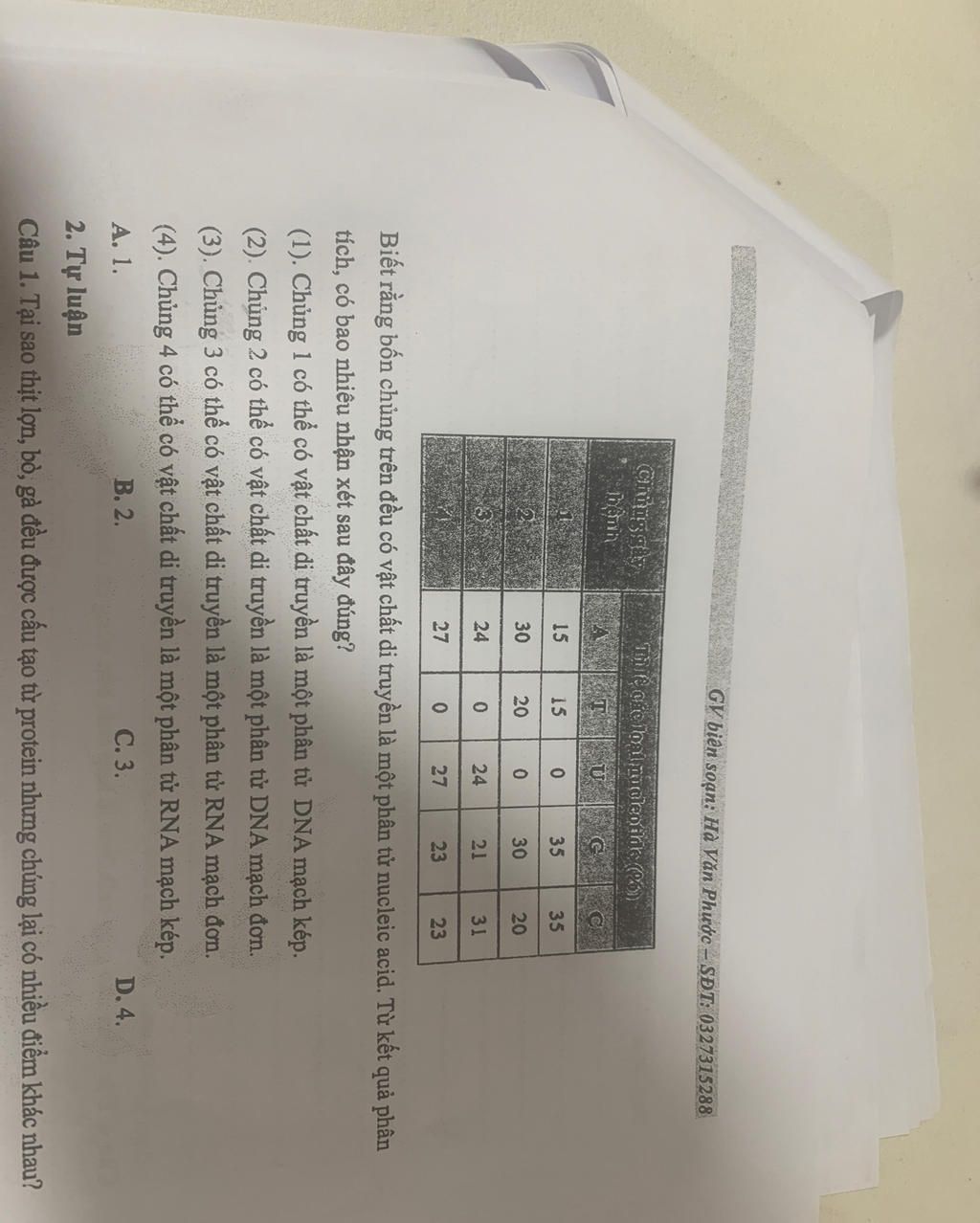 Biết rằng bốn chủng trên đều có vật chất di truyền là một phân tử nucleic acid. Từ kết quả phân