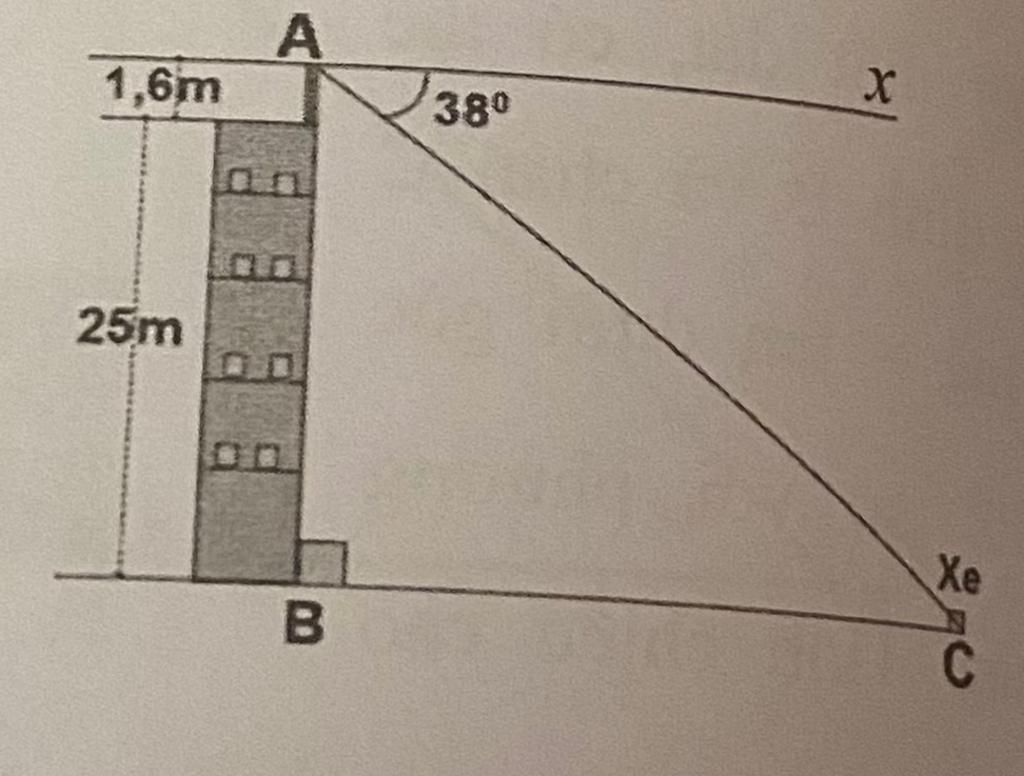 1) Một học sinh có tầm mắt cao 1,6m so với chỗ đang đứng. Hs đó đứng trên sân thượng của 1 căn nhà cao 25m, nhìn thấy 1 chiếc xe đang đứng yên với góc nghiêng xuống 38 độ ( so với phương ngang). Hỏi chiếc xe cách căn nhà bao nhiêu mét? ( Kq làm tròn đến chữ số hàng đơn vị)