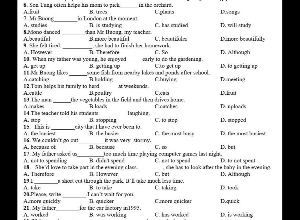 16. B ( dựa vào cấu trúc của because và because of thể phân biệt, because of + v ing và because + s +v)