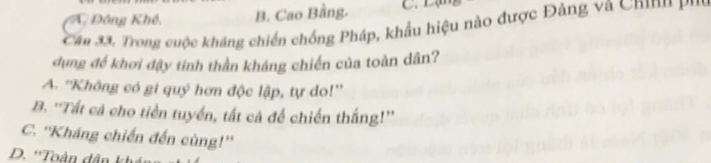 `+` Không có gì quý hơn độc lập, tự do! `-` đây là khẩu hiệu nổi tiếng do Hồ Chí Minh đưa ra trong kháng chiến chống Pháp, nhằm cổ vũ tinh thần toàn dân.