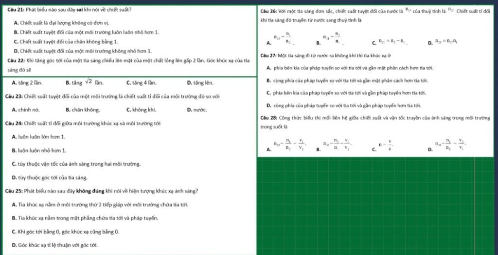 Câu 21: Phát biểu nào sau đây sai khi nói về chiết suất