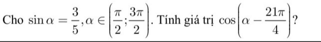 Vậy $\cos(\alpha -\frac{21\pi}{4})=\frac{\sqrt{2}}{10}$