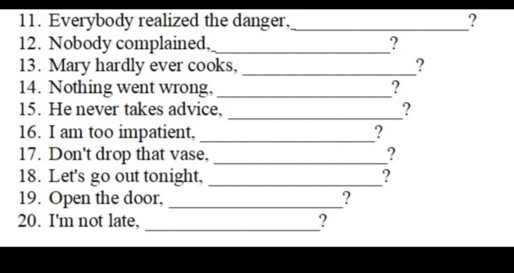 `@` Mệnh đề chính (+) `->` câu hỏi đuôi (-) và ngược lại.