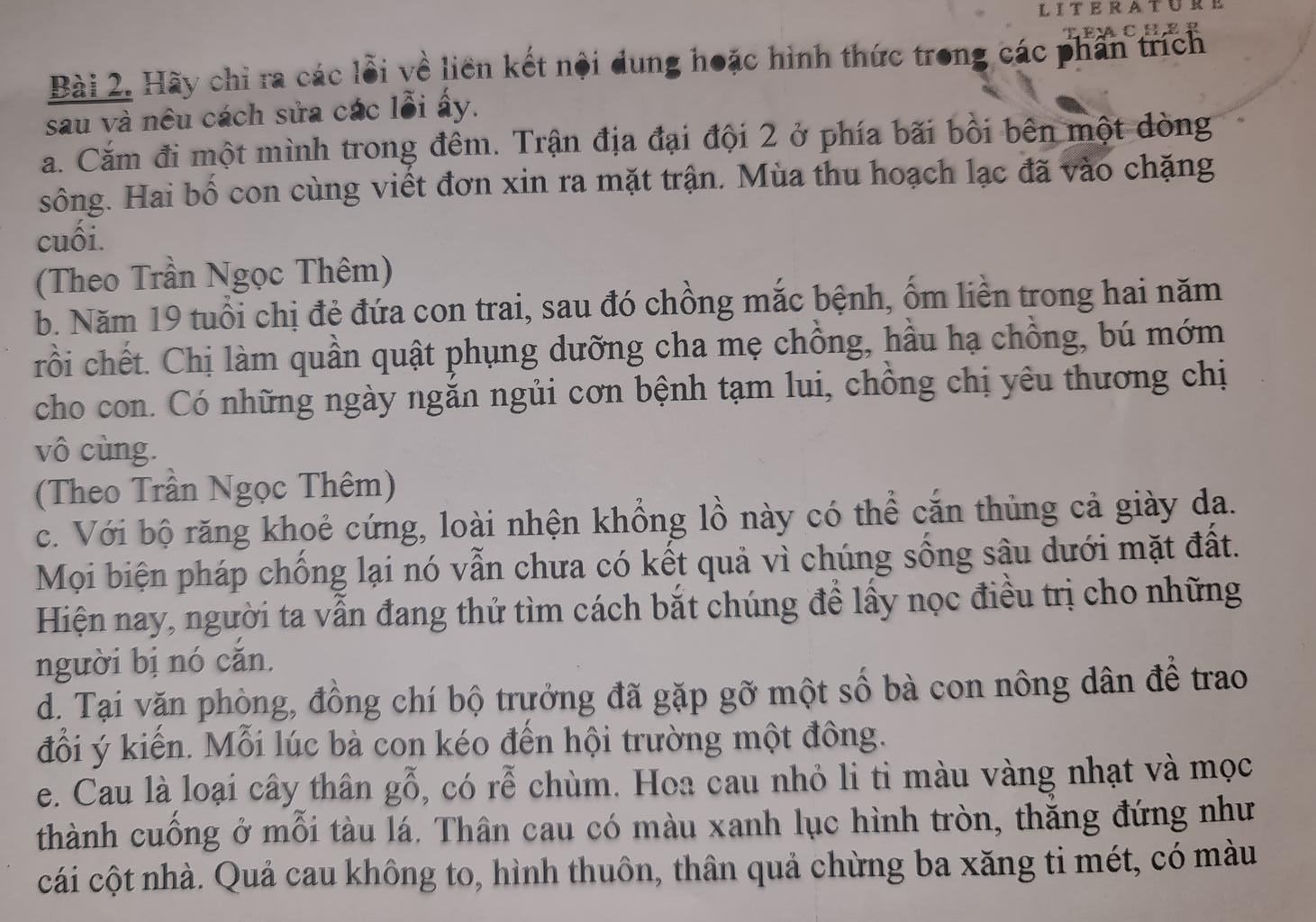 `a)+` Lỗi liên kết về nội dung: Các câu trong đoạn văn không có sự mạch lạc, không cùng diễn tả một chủ đề chung. Cụ thể: câu 1 nói về “Cắm”, câu 2 nói về “trận địa đại đội 2”, câu 3 nói về “hai bố con”, câu 4 nói về “mùa thu hoạch lạc”.