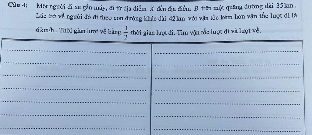 Do thời gian lượt về bằng `3/2` thời gian lượt đi, nên ta có phương trình:
