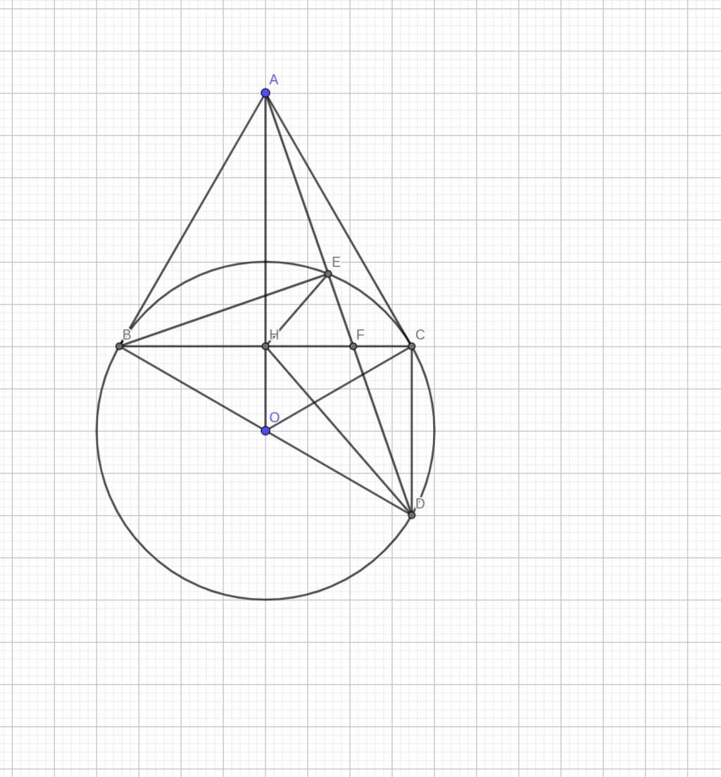 Từ một điểm A nằm ngoài đường tròn (O, R) với OA = 2R, kẻ hai tiếp tuyến AB, AC đến đường tròn (B, C là các tiếp điểm). Vẽ đường kính BD của đường tròn (O). Gọi E là giao điểm thứ hai của đường thẳng AD với đường tròn (O). Hai đường thẳng BC và AO cắt nhau tại điểm H.