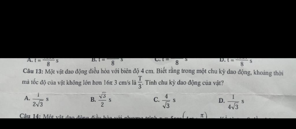T = \dfrac{{2\pi }}{\omega } = \dfrac{{2\pi }}{{8\pi \sqrt 3 }} = \dfrac{1}{{4\sqrt 3 }}\left( s \right)