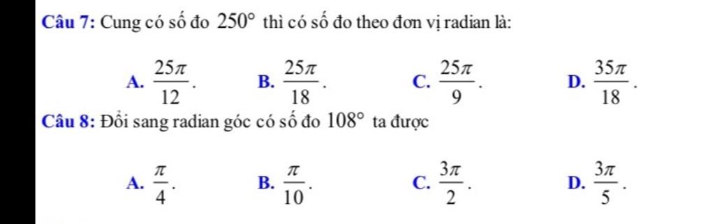 Số đo cung $250^o$ theo đơn vị radian là: