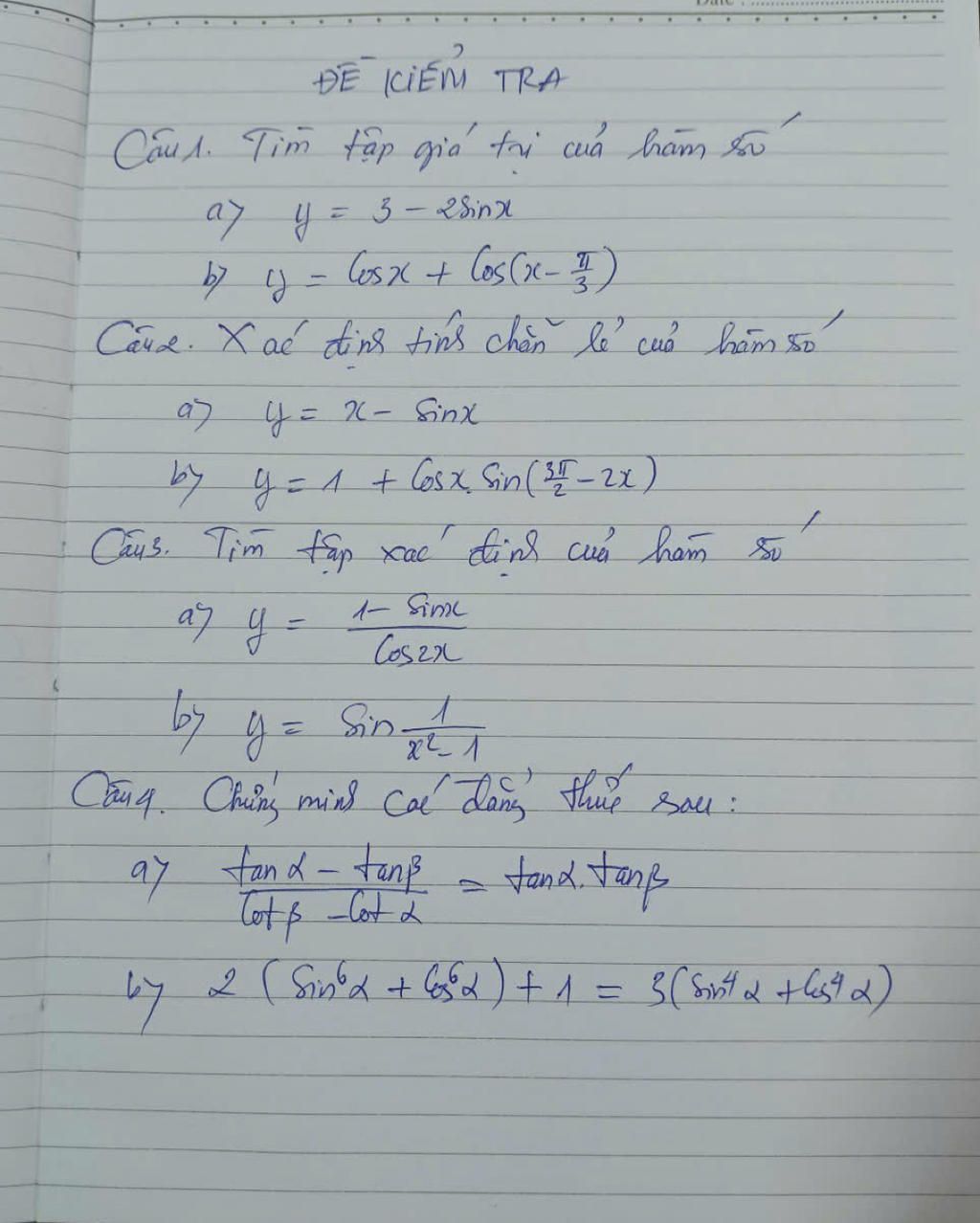 Câu 1. Tìm tập giá trị của hàm số
